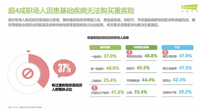 李琳的案例并非个例,艾瑞咨询近期对职场人群健康状况进行了调研,最新发布的《2025职场人“健康负债”白皮书》(以下简称《白皮书》)揭示了一组令人担忧的数据:35岁职场人“健康负债”严重,三高、结节、颈椎病成“标配”,重疾理赔同样呈现明显年轻化趋势,19-50岁职场人中35岁以下约三成有重疾理赔经历。与此同时,职场人的重疾险拒保率达37%,患肺结节、甲状腺疾病群体拒保率更超40%,带病群体用户健康保障风险仍存巨大缺口。
