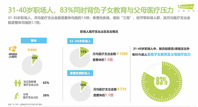 经济压力方面,31-40岁职场人面临多重负担。除了背负房租或房贷之外,83%同时背负子女教育与父母医疗多重压力。31-35岁职场人月均医疗支出金额达到1060元,是整体均值的1.5倍,患三高、结节等职场人群月均医疗支出也为平均水平的1.1倍。