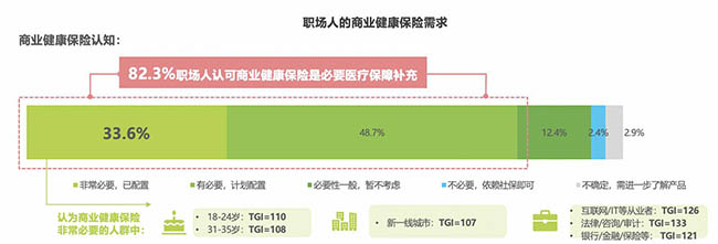 与“健康负债”相对应的,是职场人商业保险认知的普遍觉醒。《白皮书》显示,82.3%职场人认可商业健康保险是必要医疗保障补充。“90后”成为保险消费主力群体,投保职场人平均年龄33岁,人均持有2份保单。线上投保成为职场人主流选择,尤其受较高收入及有孩家庭青睐。