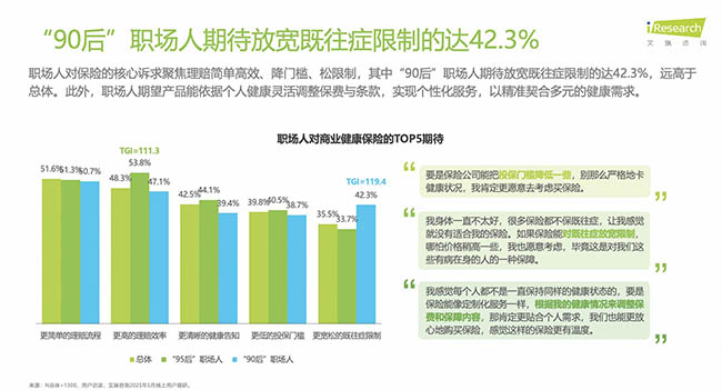 带病体保险市场正迎来历史性机遇,满足职场人特别是带病体人群的健康保障需求,将成为行业新增长点。只有切实解决带病群体"产品少、投保难、条款复杂"等痛点,才能实现保险保障的普惠价值。《白皮书》数据也显示,"90后"职场人期待放宽既往症限制的达42.3%。