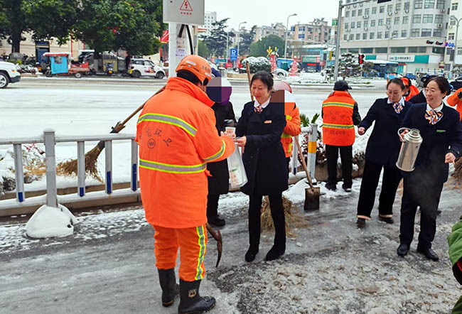 在南阳,中国人寿南阳分公司工业路客户体验中心第一时间启动“暖冬关爱”公益行动,志愿者们走上街头,为坚守岗位的环卫工人送上贴心关怀。
